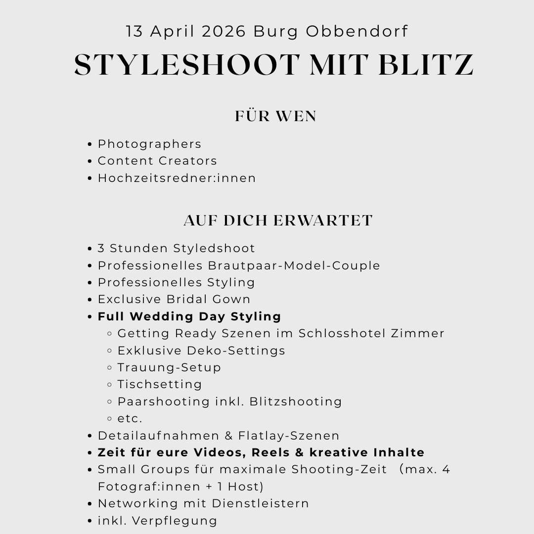 Bereite dich darauf vor, deine Hochzeitsfotografie auf ein neues Niveau zu heben! Melde dich jetzt an und sichere dir deinen Platz für dieses unvergessliche Wedding Styleshooting! 📸