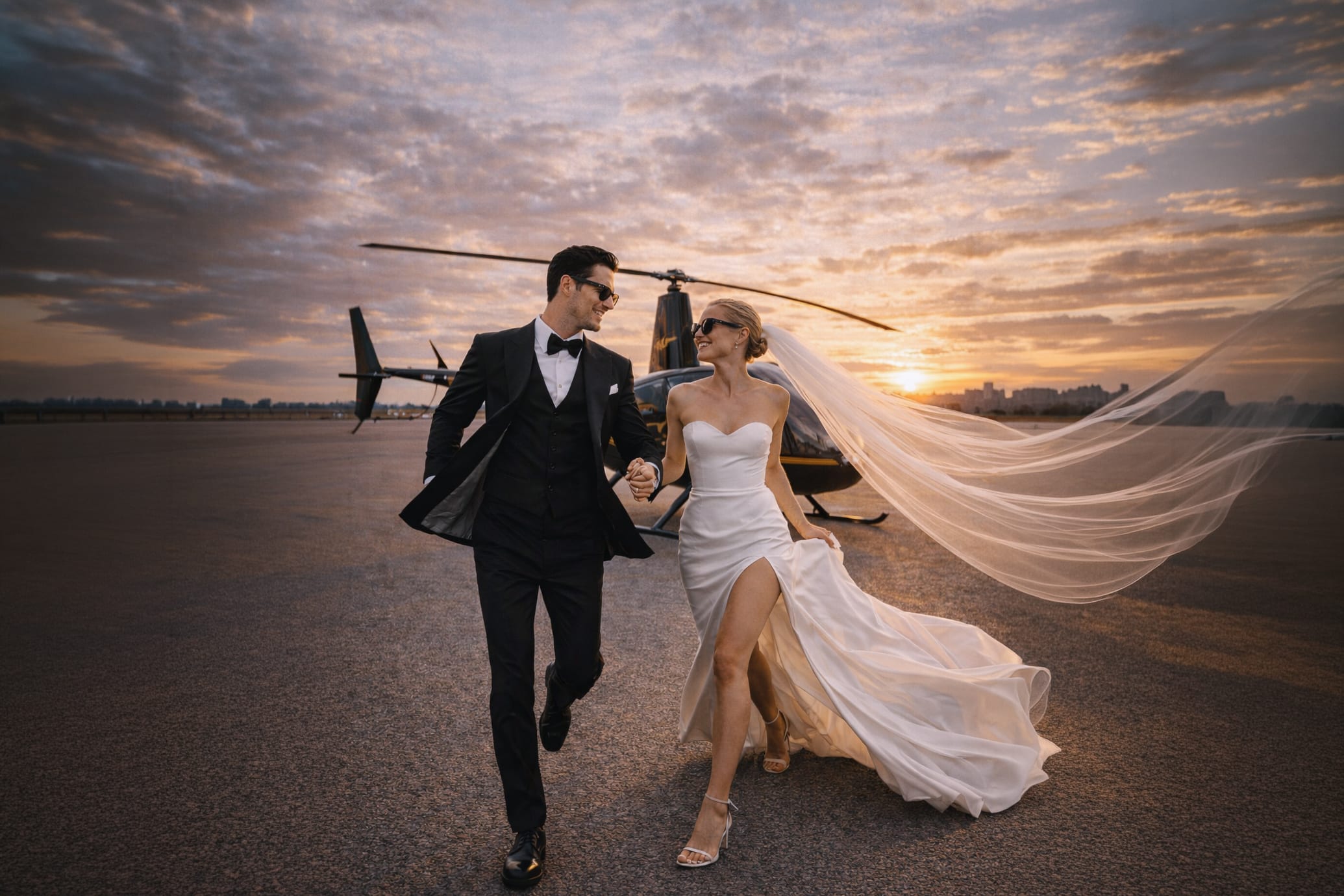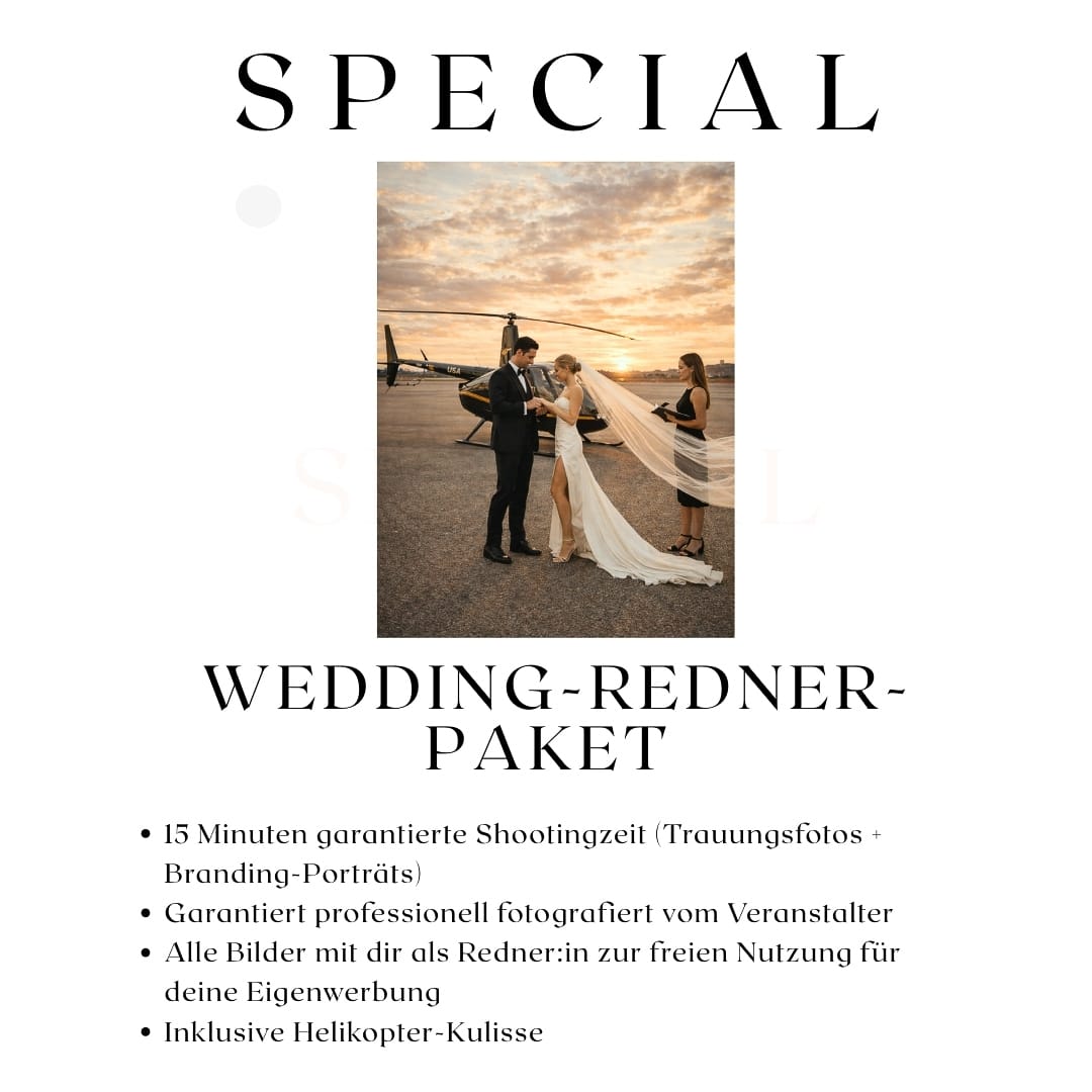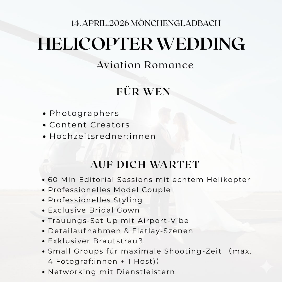 Kennenlernen ; First Look; Inszenierte Trauung; Brautpaarshooting am bzw. im Helikopter,Blitz- & Editorial-Szenen etc.